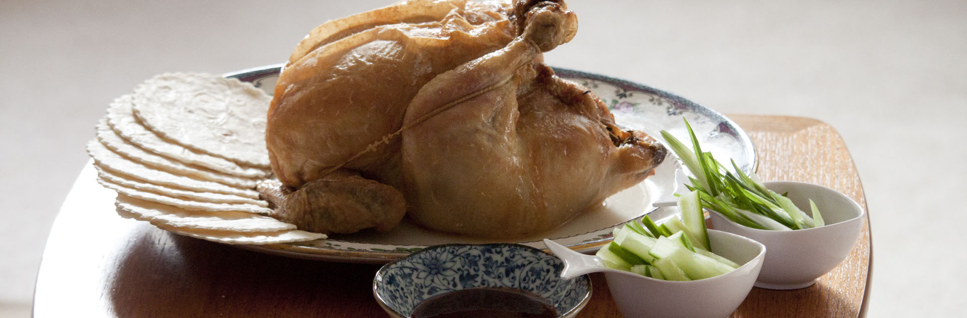 One of my favourite dinner party foods, minimum effort with maximum satisfaction and guests can have some D.I.Y. fun! The chicken is marinated with herbs to keep it moist and is accompanied by homemade BBQ sauce, cucumber and spring onion wrapped in a slice of pancake.