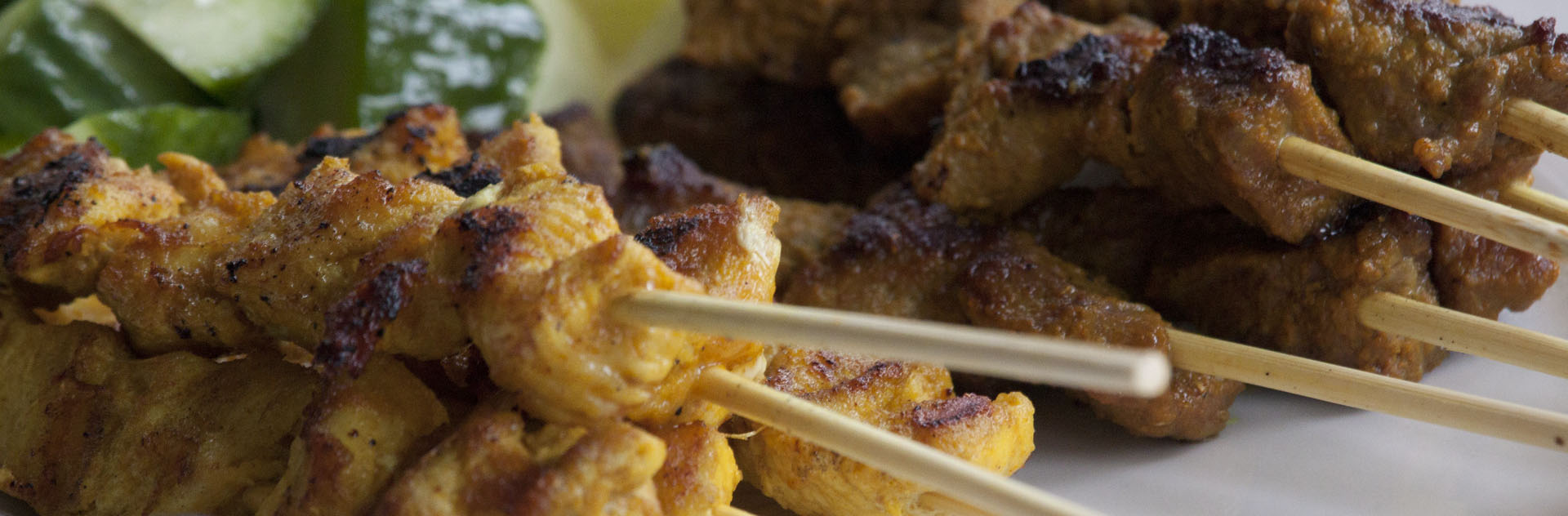 Chicken and beef marinated in a special Malaysian curry paste, grilled and served with a peanut sauce. Accompanied with chopped cucmber and onions.